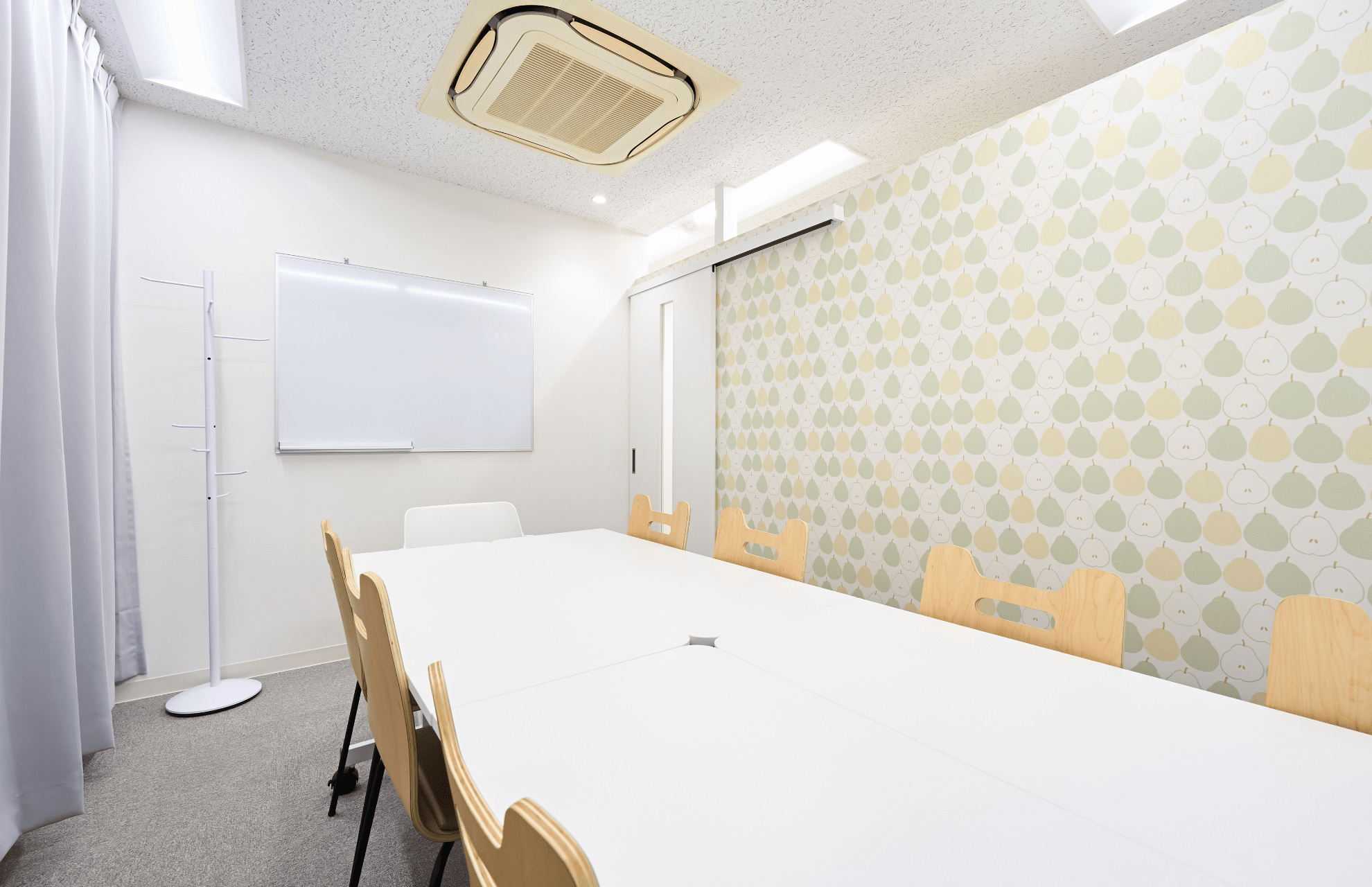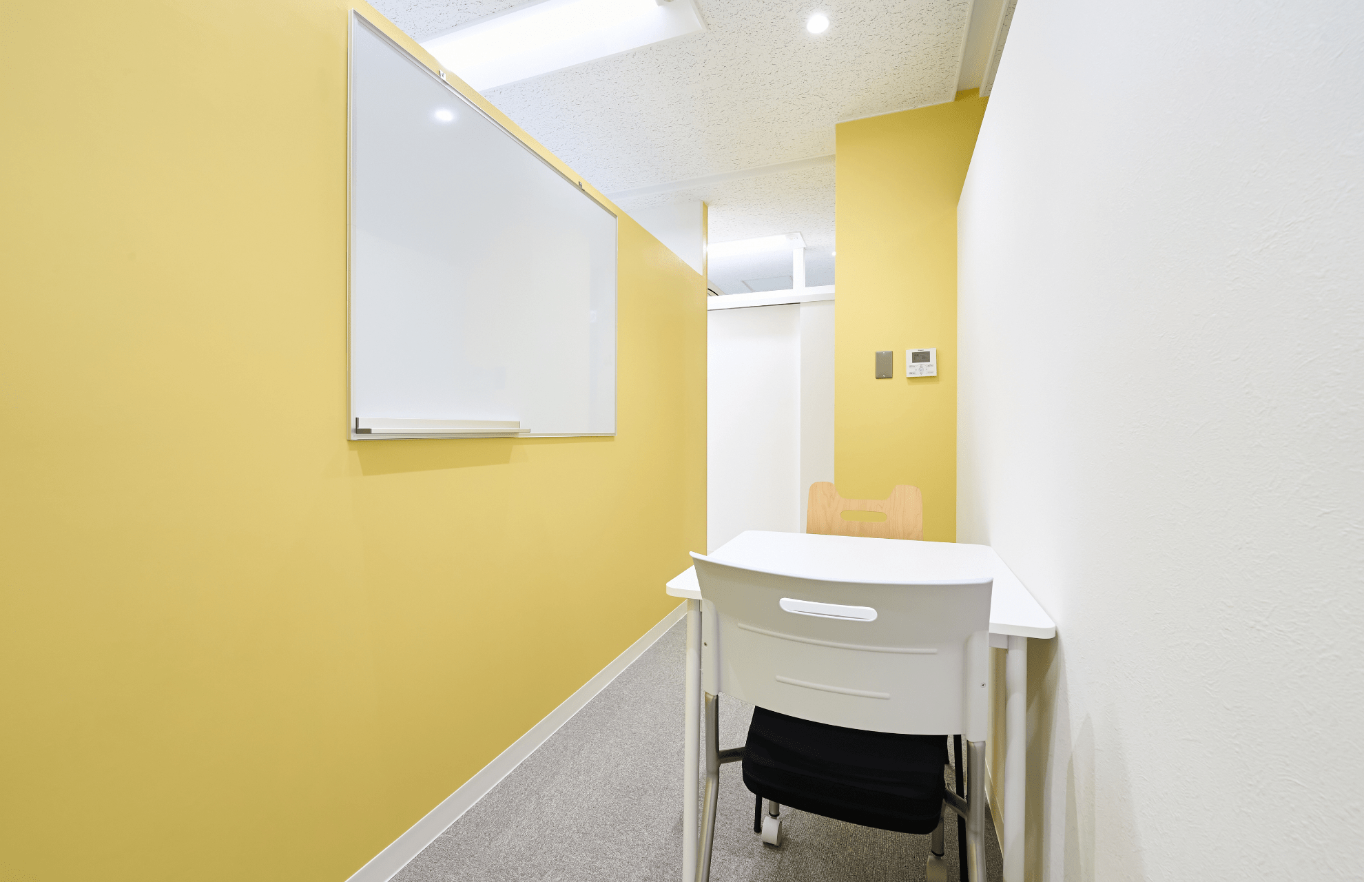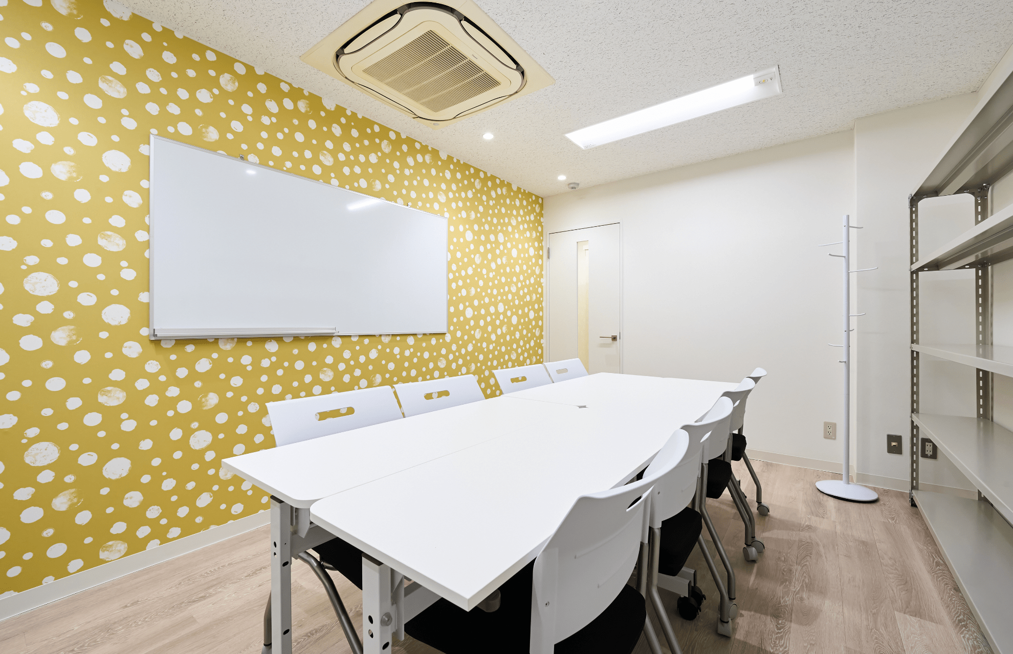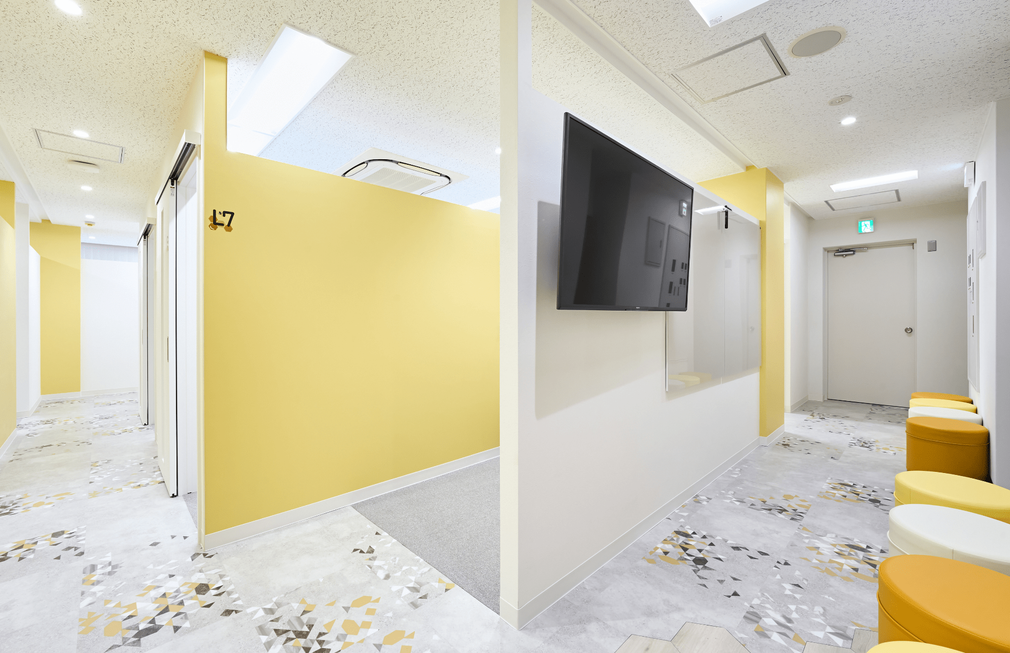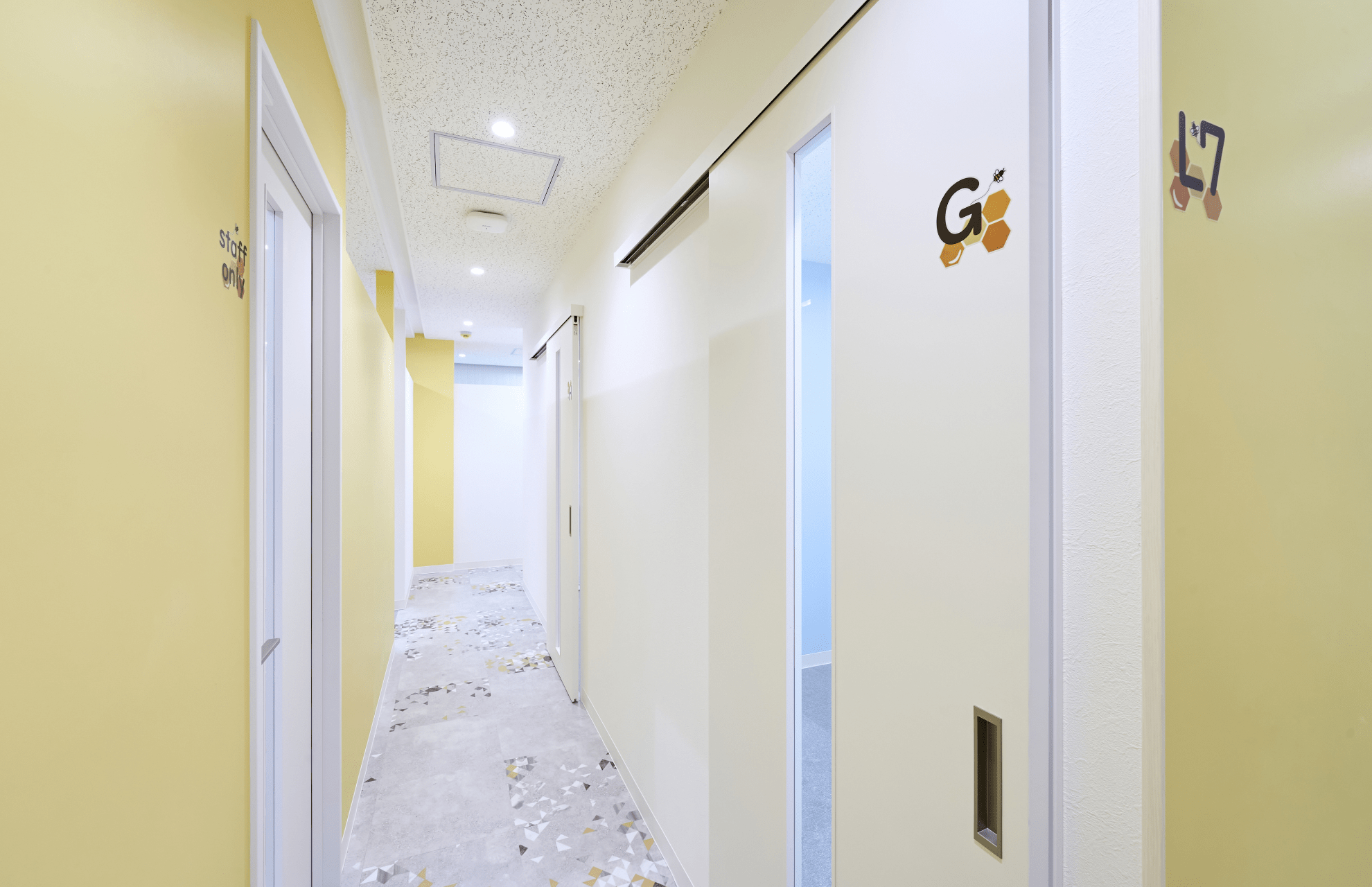 イエロー&ホワイトのメリハリあるカラーリングと、ハチミツを連想させるヘキサゴンモチーフが印象的な空間に仕上がっています。各教室には異なるパステルカラーの壁紙を採用し、生徒の皆さんが入るたびにワクワクする空間になっています。床には5階で使用しているテラゾー柄の雰囲気を取り入れ、アクセントとしてイエローをプラス。フロア全体で統一感と温かみを感じられるデザインとしました。
