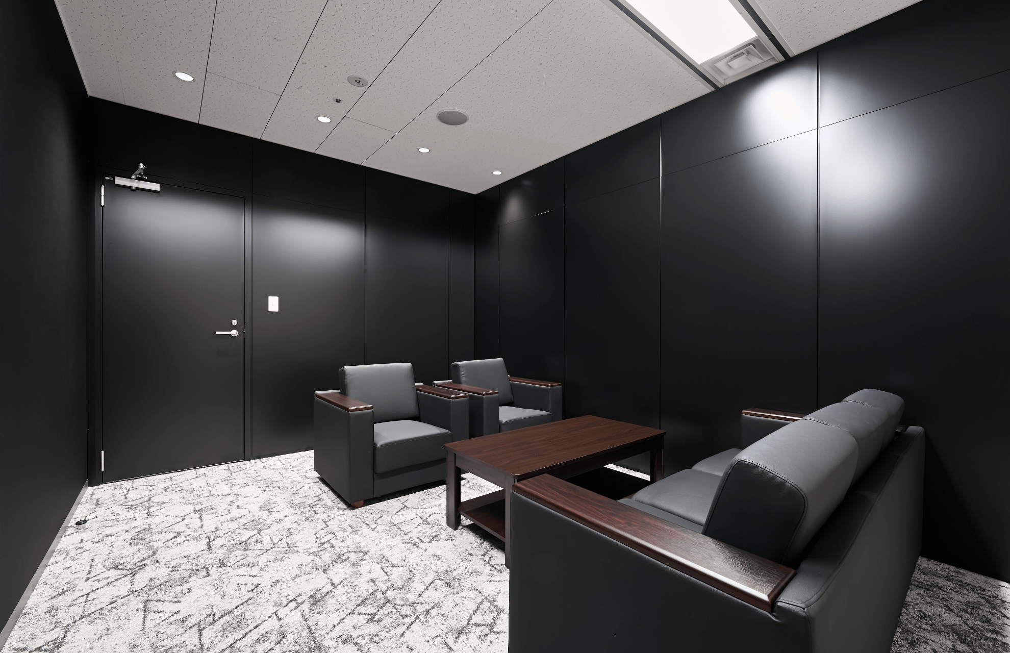 応接室は黒を基調にしながら、場が暗くなりすぎないよう明るい床材や茶色をポイントに配置し空間ごとに最適なバランスを調節しました。