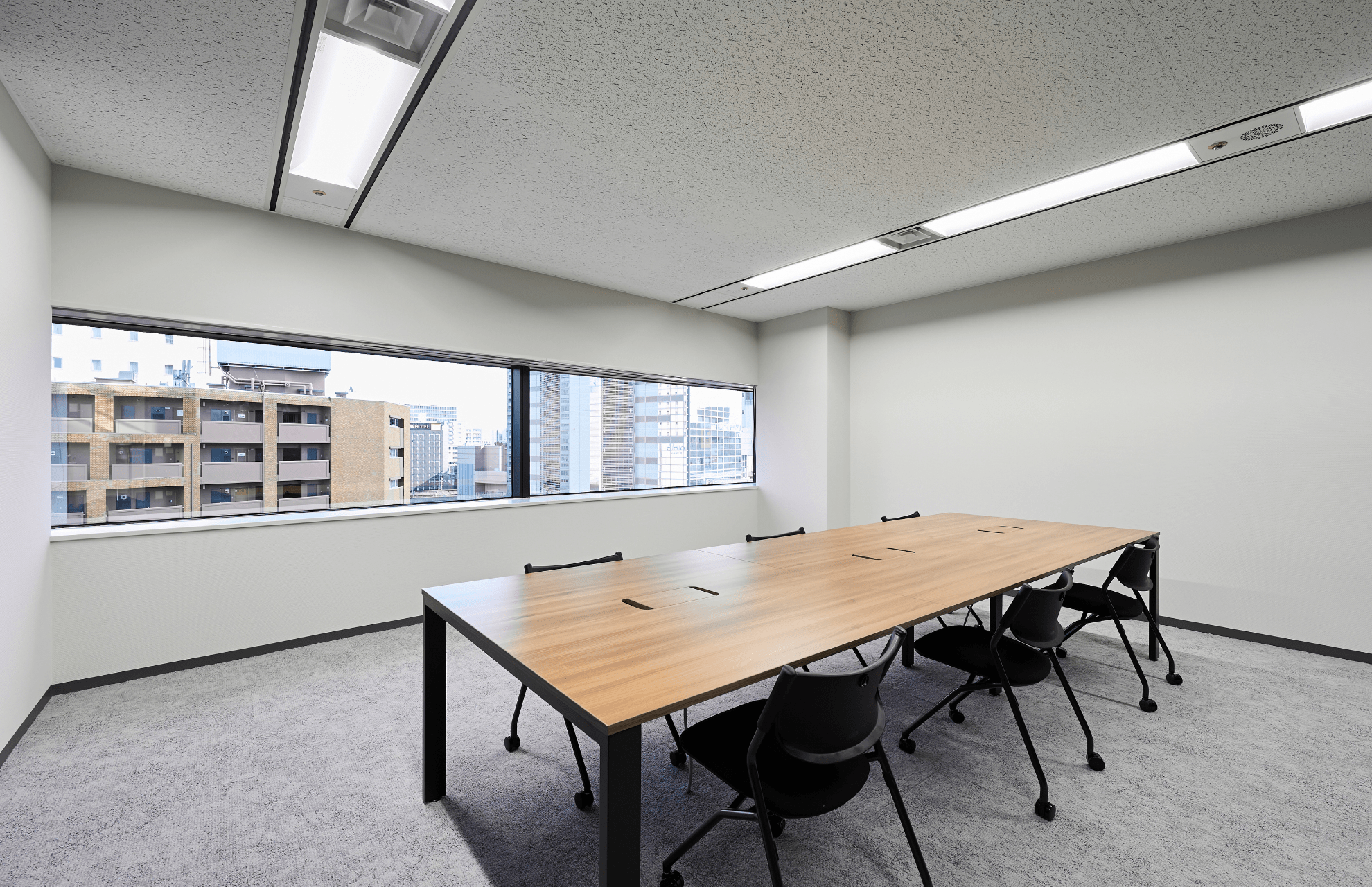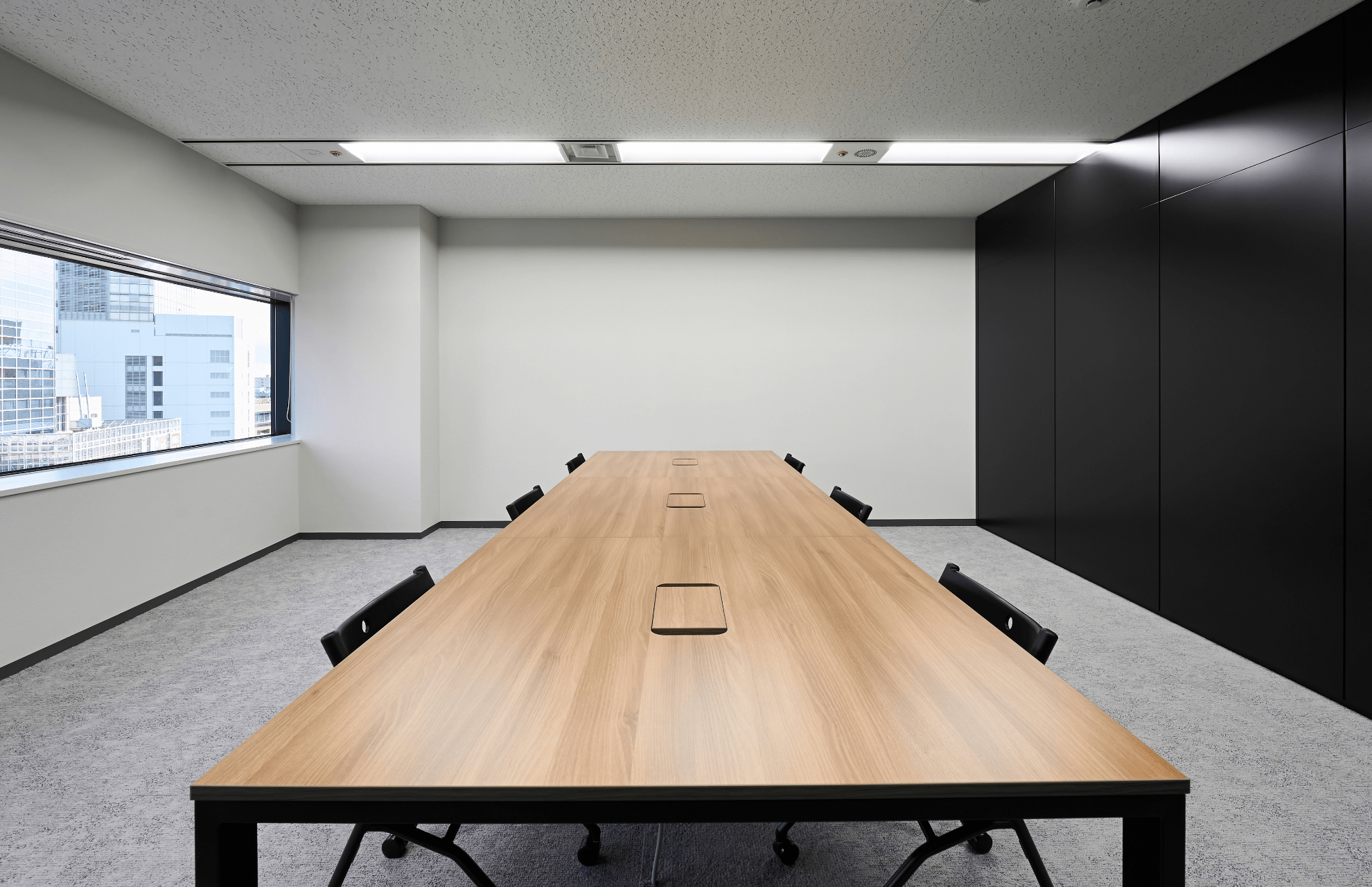 全体的に黒いパーテーションを組み合わせることで、白では出しづらい引き締まった印象を演出しつつ、シンプルで扱いやすい上品なオフィスをご提案いたしました。