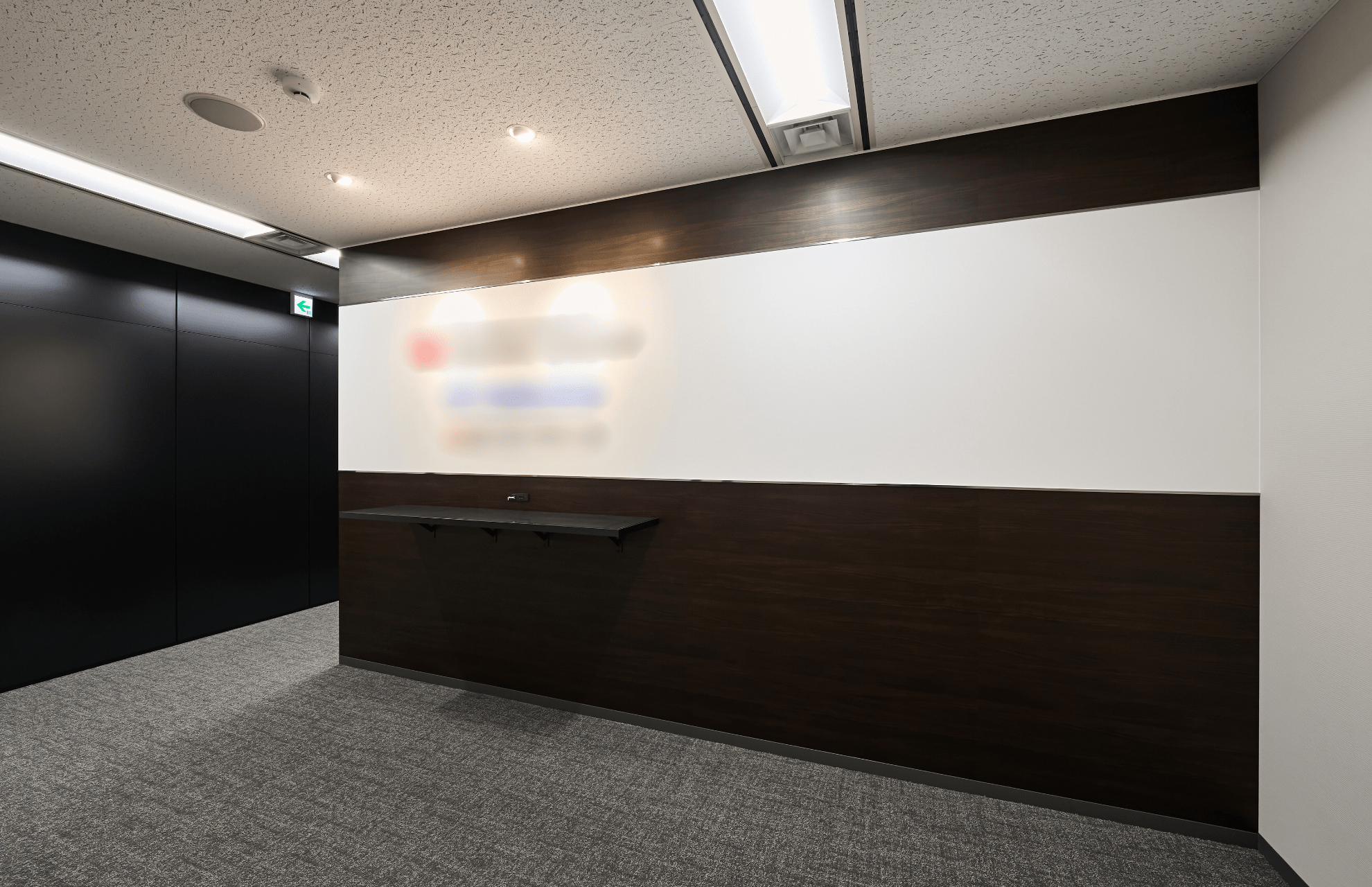 エントランスは、重厚感のある濃い木目シートを基調にロゴ帯を切り替えた壁面デザインを採用しました。スポットライトを効果的に使用することで、空間の落ち着いたトーンの中でも象徴性が際立つデザインとしました。