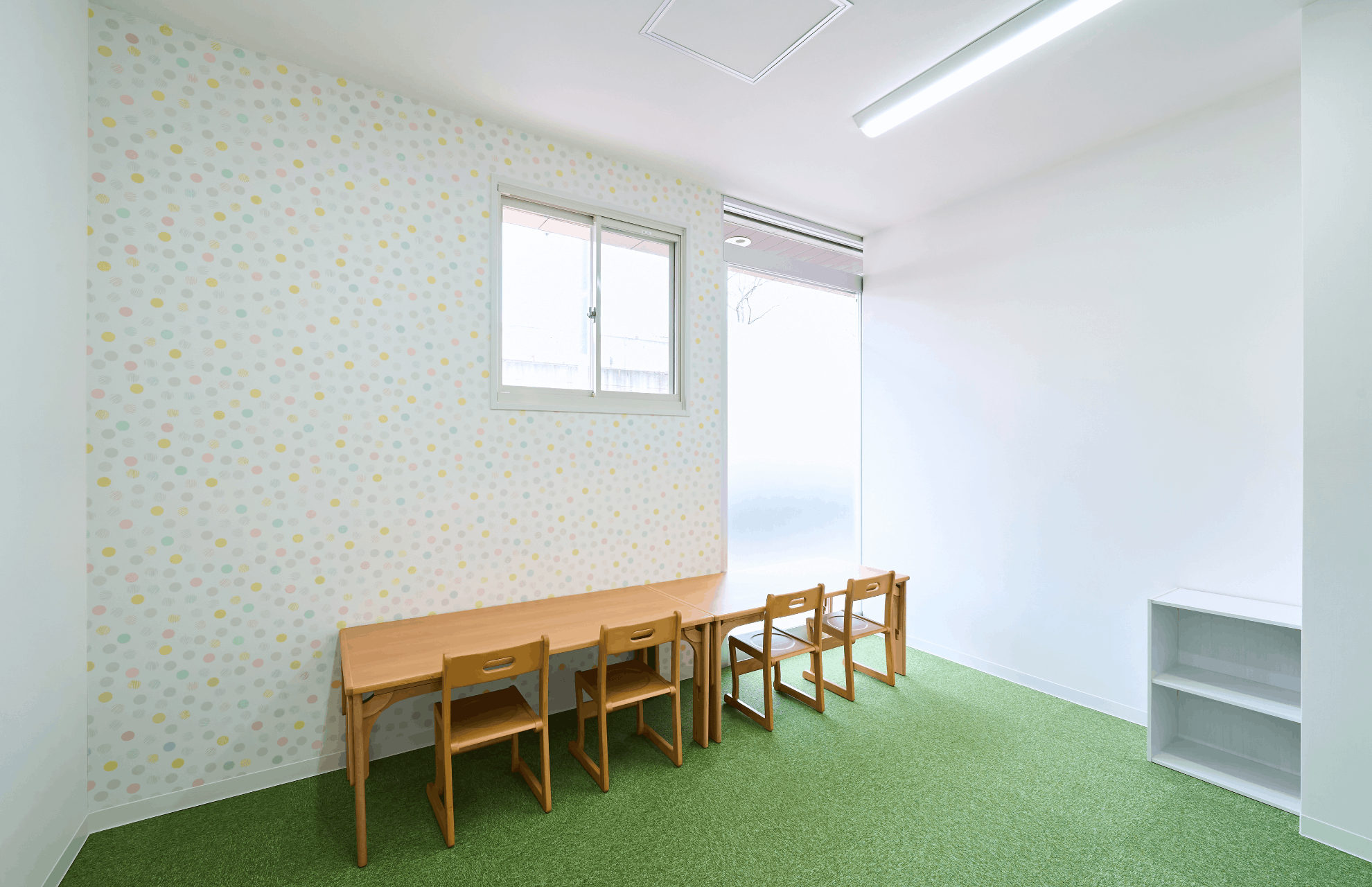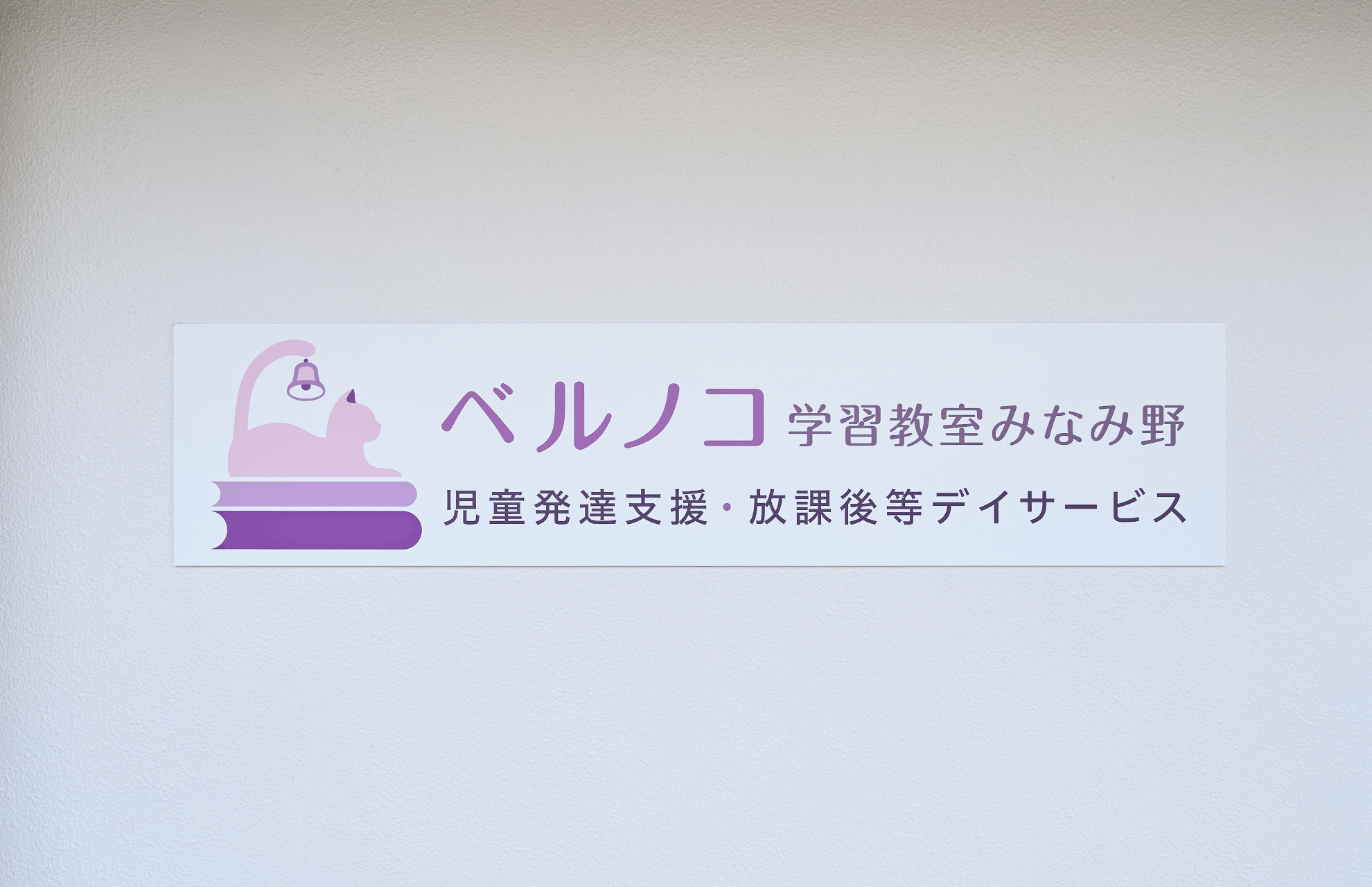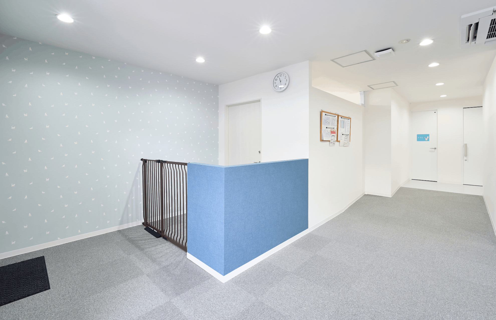 特に、お子様が視覚的に部屋を区別しやすいよう床のマットを部屋ごとに色分けする一方で、集中力を妨げないよう全体の柄を抑えるなど、現場の運用に即した細やかな配慮を施しています。また、個別支援室には外側から見守り可能なマジックミラーを設置し、各部屋のドアの鍵は、お子様が不用意に開けられないようドアの上部へ配置いたしました。こうした工夫に加え、内装に使用したネコ柄のクロスから、弊社グループ会社の株式会社ジャシックがロゴマークをデザインし、空間に統一感を持たせています。