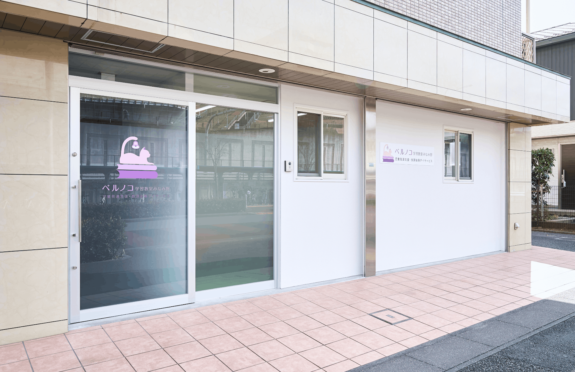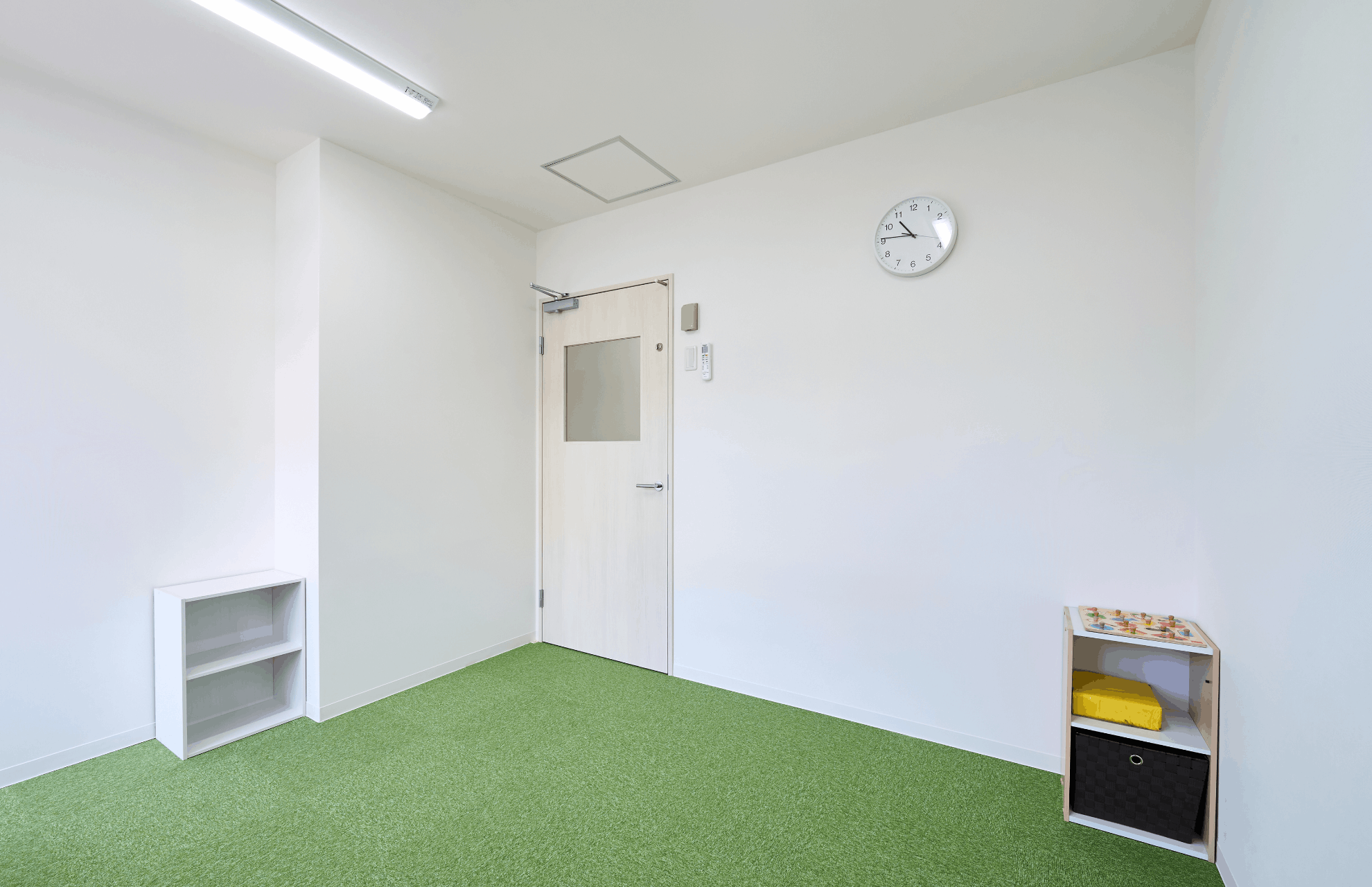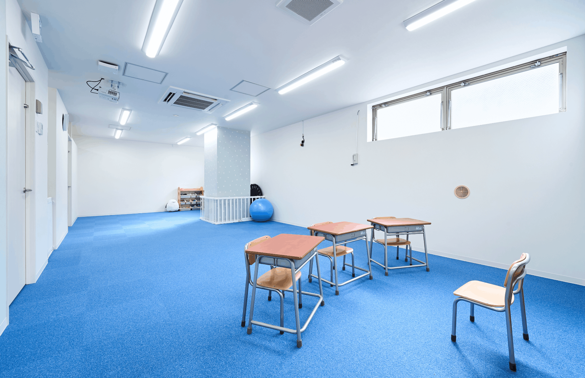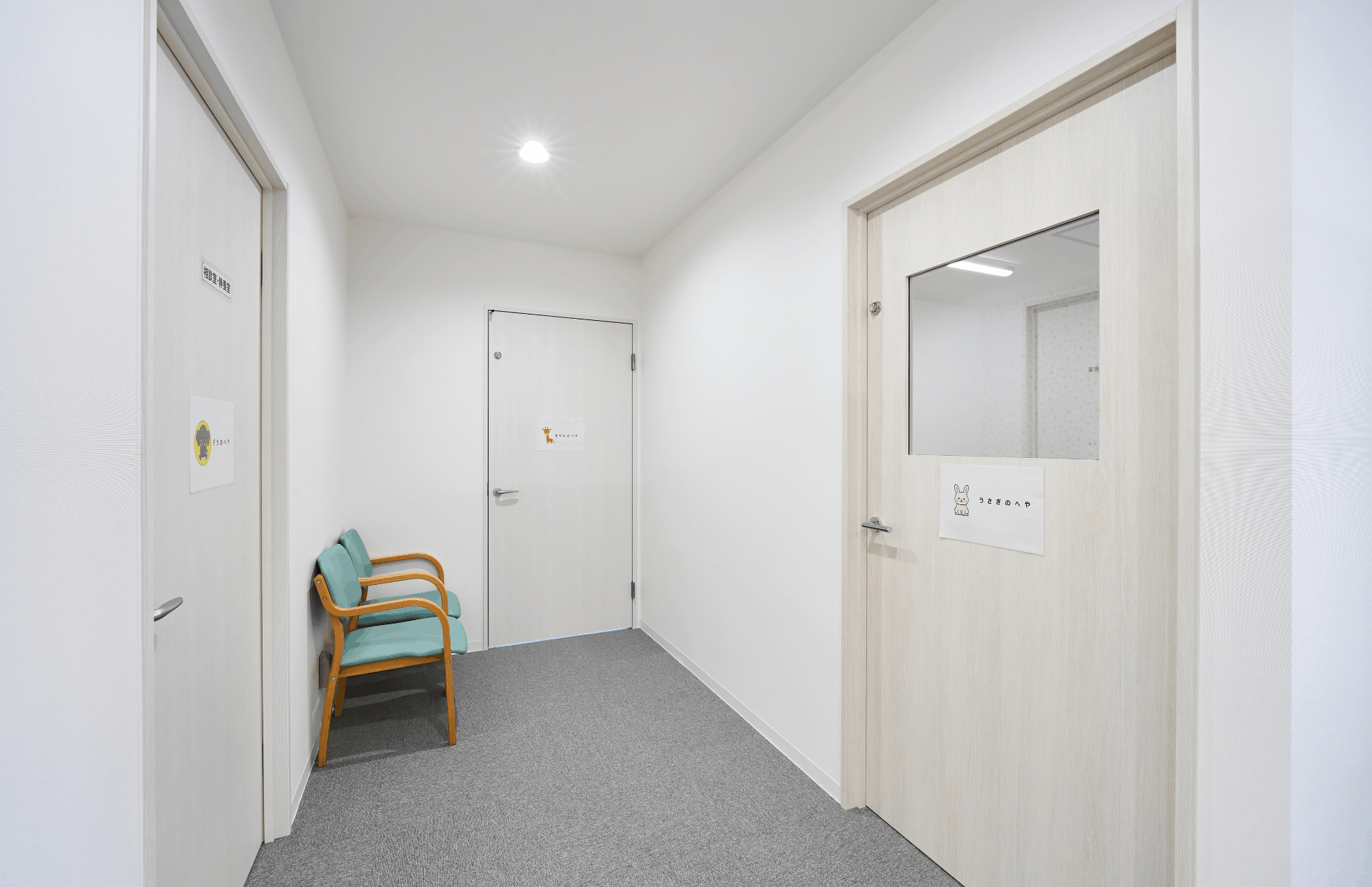 特に、お子様が視覚的に部屋を区別しやすいよう床のマットを部屋ごとに色分けする一方で、集中力を妨げないよう全体の柄を抑えるなど、現場の運用に即した細やかな配慮を施しています。また、個別支援室には外側から見守り可能なマジックミラーを設置し、各部屋のドアの鍵は、お子様が不用意に開けられないようドアの上部へ配置いたしました。こうした工夫に加え、内装に使用したネコ柄のクロスから、弊社グループ会社の株式会社ジャシックがロゴマークをデザインし、空間に統一感を持たせています。