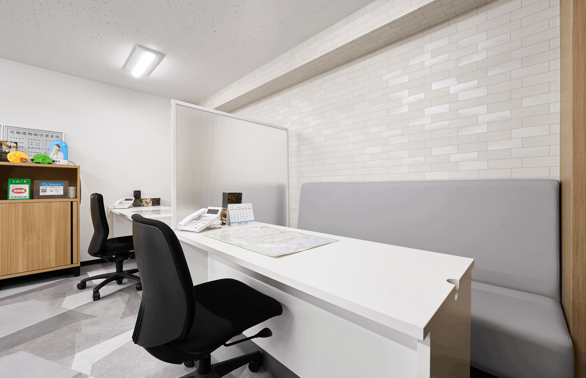 設計では、来客側も執務エリアもゆったりと過ごせるようエリア同士の距離感や配置を細かく調節しました。白を基調とした清潔感のある空間に、木目調のアクセントを取り入れることで、洗練された中にもどこかホッとする心地よい雰囲気を演出しています。